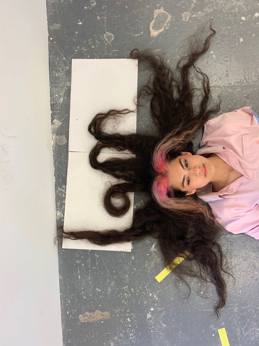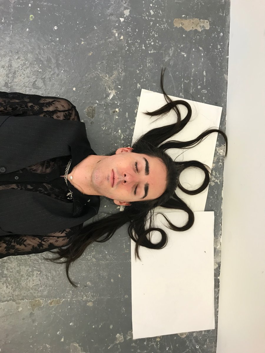 Regarding my choice of type, material, and placement of my text, I knew I wanted to think outside of the box. When the tutors said, “Place your text on the building” I immediately knew what they wanted from us. Instead of getting bogged down in cutting out each individual letter of my text with stencils, I immediately began sourcing creative locations around the building to utilize, the sink to start for example, purely because of the performative aspect of washing written ink down the drain. After the first text, me and my partner, we chose to collaborate after we both ran to the sink, decided to write words in our long hair whilst laying on the floor, still using a place in the building, but again, adding a more performative aspect to our piece and creating a new type that no one has seen before. I didn’t just want to write my text on every surface I could find, I wanted to find a new innovative way to create type. I think through the collaboration of my partner and I, we were able to come up with this idea and execute it very well.